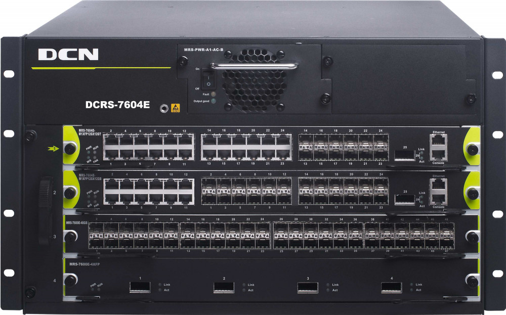 DCRS-7604E adalah switch chassis 4 slot. Dapat bekerja dengan 1 atau 2 modul manajemen dan 3 atau 2 modul bisnis. Ini memiliki port bisnis pada modul manajemen yang memungkinkan kepadatan tinggi.
