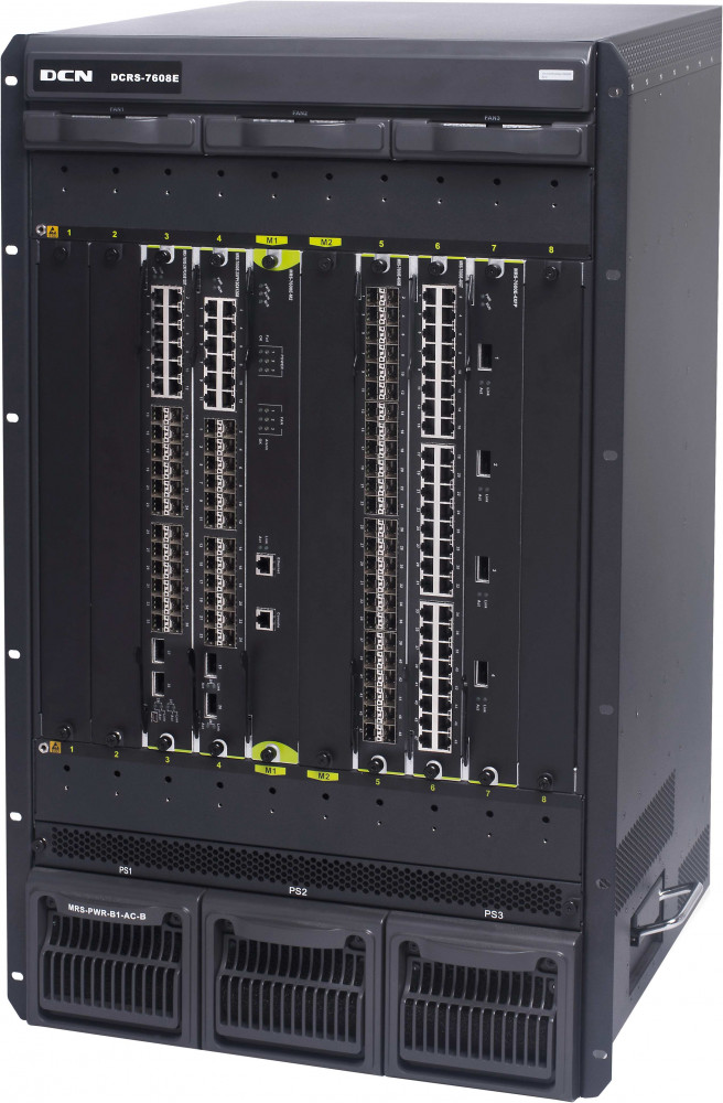DCRS-7608E memiliki 10 slot. Ini memiliki 2 slot manajemen dan 8 slot bisnis. Semua konfigurasi slot bisnis dapat berupa kombinasi apa pun dari modul antarmuka jaringan.